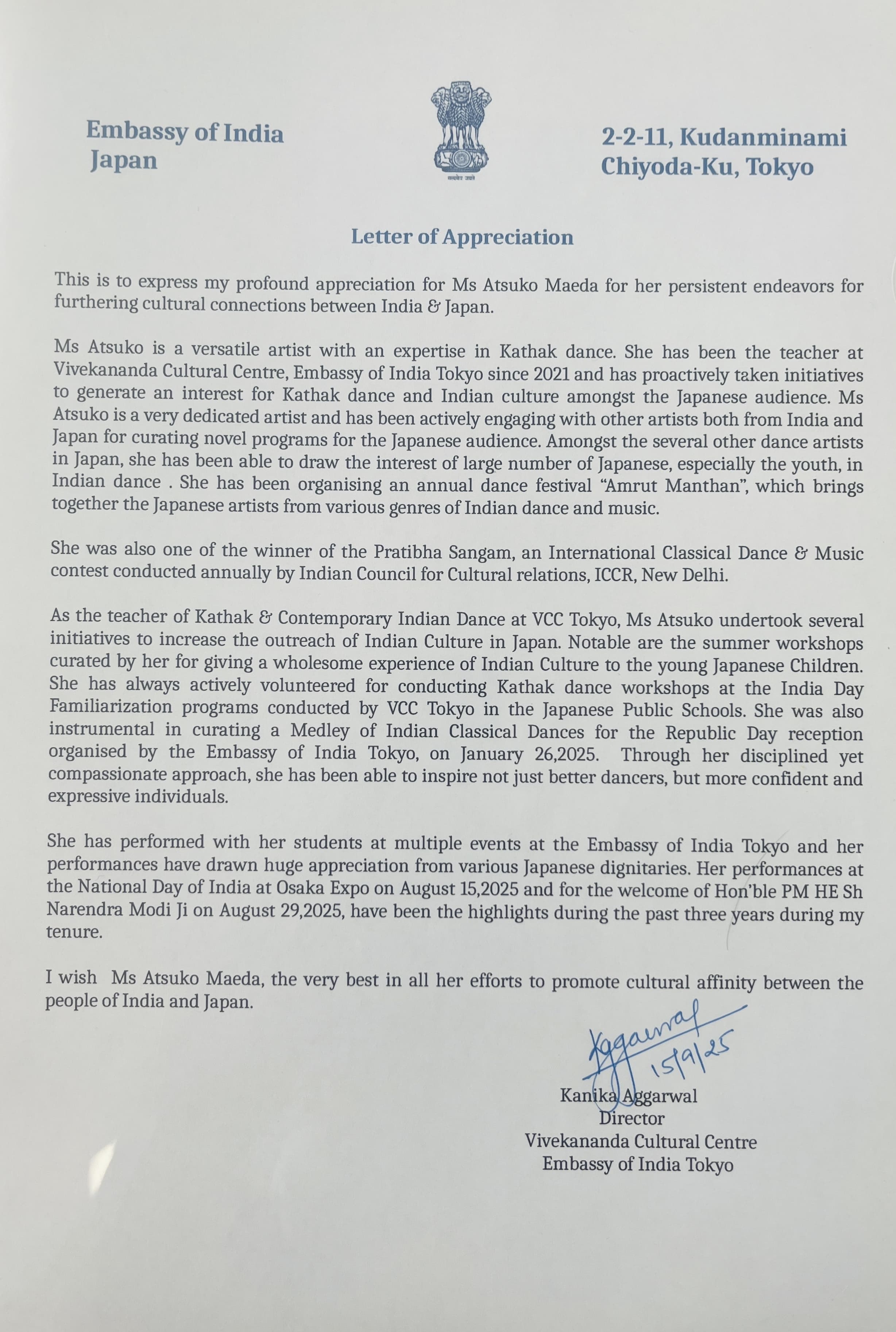 彼女はインド大使館での数々ほイベントで生徒達と群舞を上演し、そのパフォーマンスは日本の要人ゲストより大きな賞賛を集めました2025年8月15日大阪万博で開催されたインド共和国建国記念日の式典と、2025年8月29日に行われたナレンドラ・モディ首相閣下歓迎式典における彼女の上演は、私の任期三年間のハイライトでした。